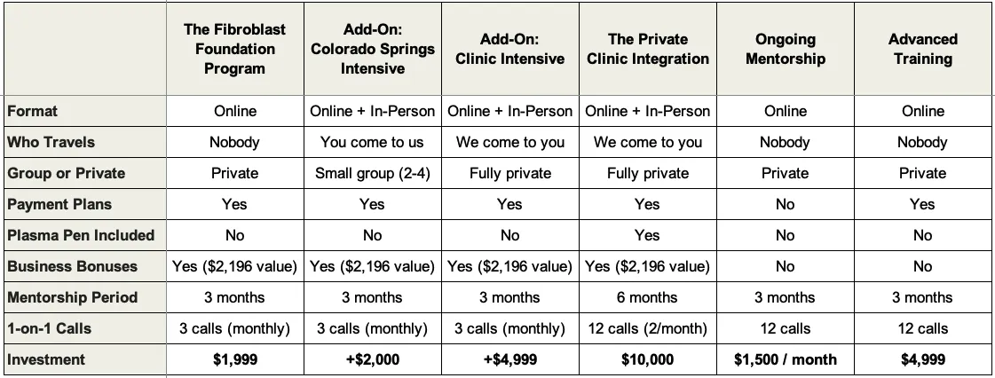 It is a complete business transformation delivered on your premises. Jasmine comes to you, works alongside your team, and leaves your clinic equipped to perform, market, and scale fibroblast with full confidence.